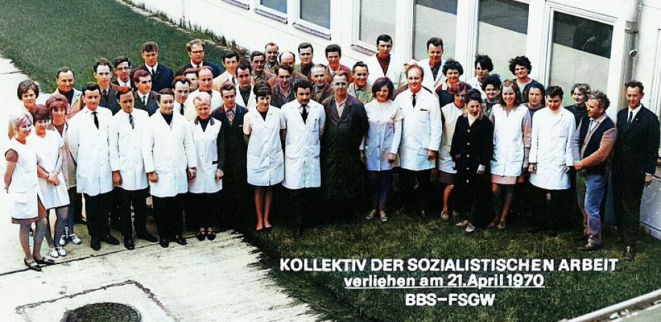 Am 1. September 1970 begann in Staßfurt für uns ein neuer Lebensabschnitt. Am "Tag des einheitlichen Lehrbeginns" starteten wir im VEB Fernsehgerätewerke Staßfurt die dreijährige Berufsausbildung zum Elekektronikfacharbeiter mit Abitur. Am ersten Tag der praktischen Ausbildung in der Lehrwerkstatt entstanden die obligatorischen Gruppenbilder mit unseren Lehrausbildern. Damals noch als Schwarz-Weiß-Foto, habe ich die Bilder mittels Software am Computer koloriert.